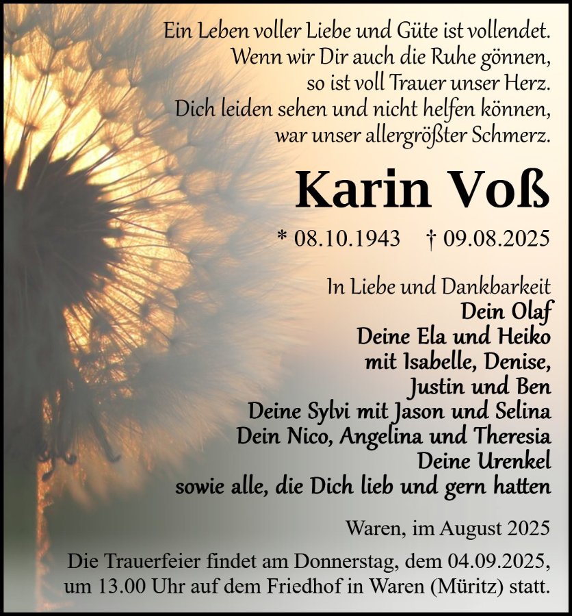 jeden Tag frage ich mich, wo du gerade bist. Ich frage mich, ob du mich siehst, ob du mich hörst. Ich hoffe so sehr, dass du weißt, wie sehr ich dich liebe. Du warst so eine wundervolle Mama, und es ist unbegreiflich, wie viel Kraft du hattest, uns vier Kinder großzuziehen. Ich danke dir für die unendliche Liebe und Fürsorge, die mich zu dem Menschen gemacht haben, der ich heute bin Schon als kleines Kind warst du mein sicherer Hafen. Ich erinnere mich daran, wie ich auf deinem Schoß saß und mich in deinen Armen so geborgen fühlte. Oder abends vorm schlafengehen ,der Ofen geheizt, das Federbett aufgeschüttelt und dann den Wecker aufgezogen hast Dieses Geräusch werde ich niemals vergessen. Ich habe so gern neben dir gelegen selbst als ich schon erwachsen war. Die Welt hat seit deinem Fortgang ihre Farben verloren. Ein Teil von mir ist mit dir gegangen, und es schmerzt zutiefst zu wissen, dass ich mich nie wieder an dich kuscheln, dich umarmen oder dich küssen kann. Ich vermisse deine Stimme, dein Lachen, deine bloße Anwesenheit, die das Leben so hell und schön gemacht hat. Jeder Tag ohne dich ist eine unerträgliche Qual. Der Gedanke, mein ganzes Leben ohne dich weiterleben zu müssen, zerreißt mein Herz in tausend Stücke. Ich werde dich niemals vergessen und jede Sekunde an dich denken. Ich hoffe, da, wo du jetzt bist, geht es dir gut, und deine Leiden haben ein Ende gefunden, und du bist wieder mit Dreas vereint Dies ist ein schöner Gedanke denn dies war immer dein Wunsch bei ihm zu sein. Jetzt achtet ihr beide auf mich. Danke für all die Liebe die ihr mir gabt All dies ist in mir verankert. Ihr fehlt mir schrecklich😢.